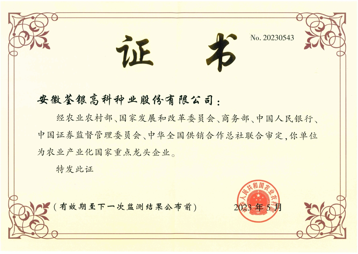 安徽荃銀高科種業(yè)股份有限公司是一家“以種業(yè)為核心、農(nóng)業(yè)服務(wù)為延伸、探索和創(chuàng)新農(nóng)業(yè)多元化發(fā)展”的現(xiàn)代高科技種業(yè)上市公司,證券代碼:300087。公司注冊資金9.47億元,系“中國種業(yè)領(lǐng)軍企業(yè)、農(nóng)業(yè)產(chǎn)業(yè)化國家重點龍頭企業(yè)、國家高新技術(shù)企業(yè)、農(nóng)業(yè)部首批農(nóng)作物種子育繁推一體化企業(yè)、中國種業(yè)信用明星企業(yè)"。在國內(nèi)控股子公司20多家,在國外設(shè)立分支機構(gòu)4家,良種銷售至全國20多個?。ㄊ?、區(qū)),出口覆蓋20多個國家與地區(qū),種業(yè)綜合實力、雜交水稻研發(fā)、推廣及海外業(yè)務(wù)規(guī)模均居全國種子企業(yè)前2位。